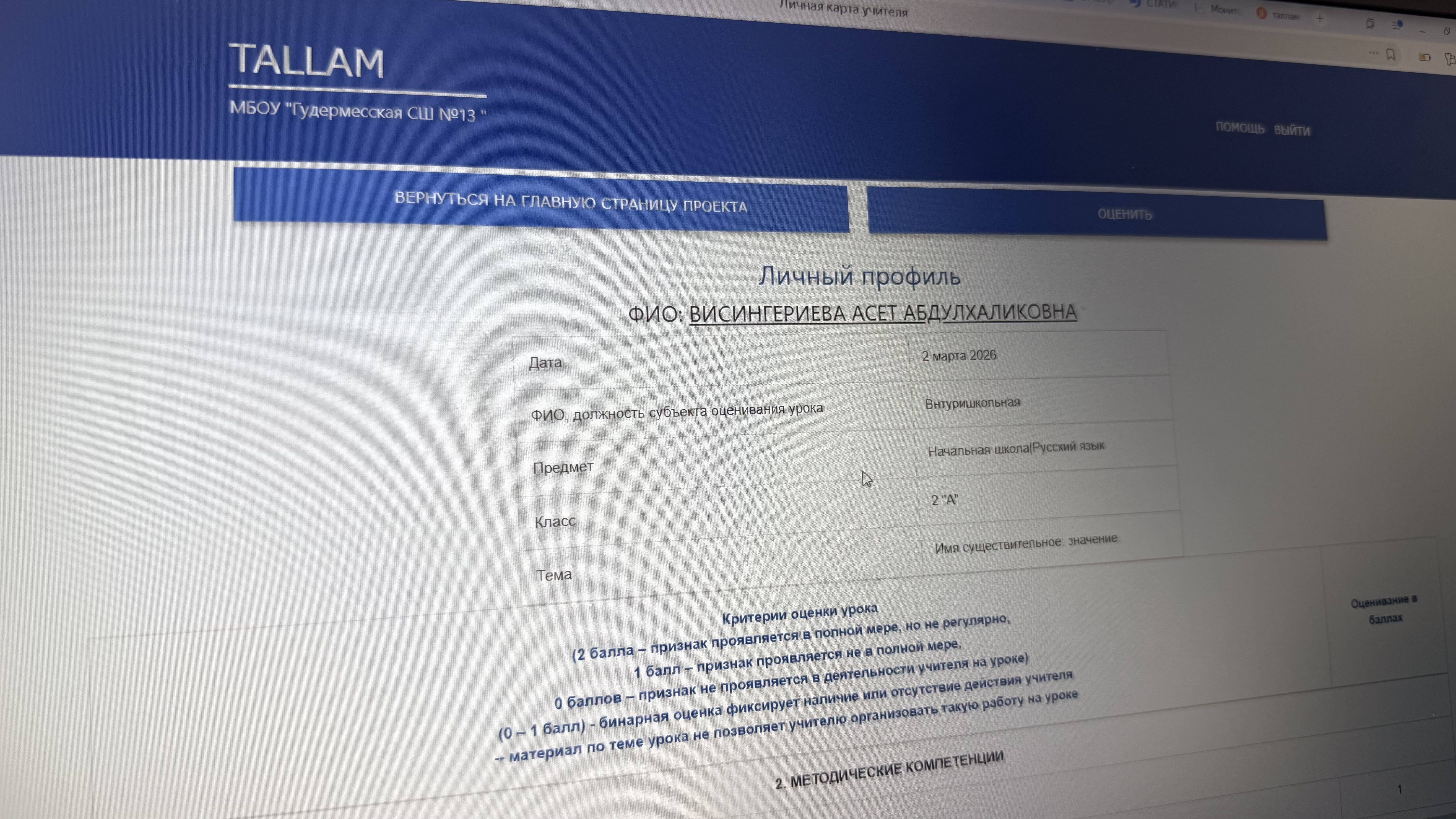 Урок оценивался на информационно-аналитической платформе «Таллам»